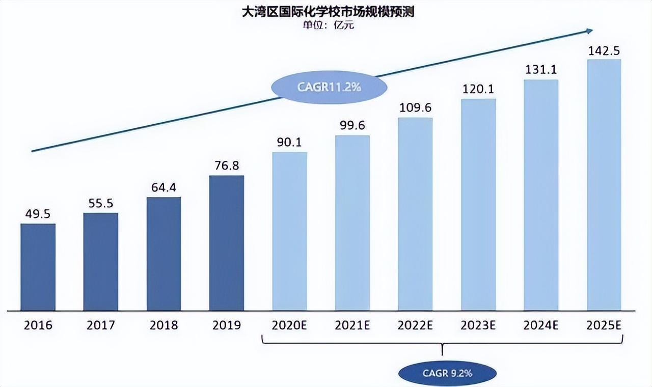 据数据预测,2022年大湾区国际化学校市场营收规模达到109.6亿元,复合增长率达到9.2%。