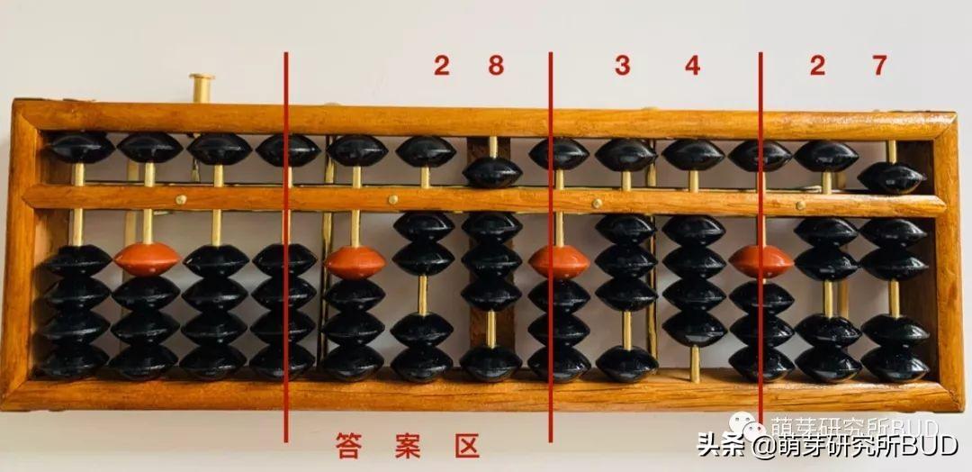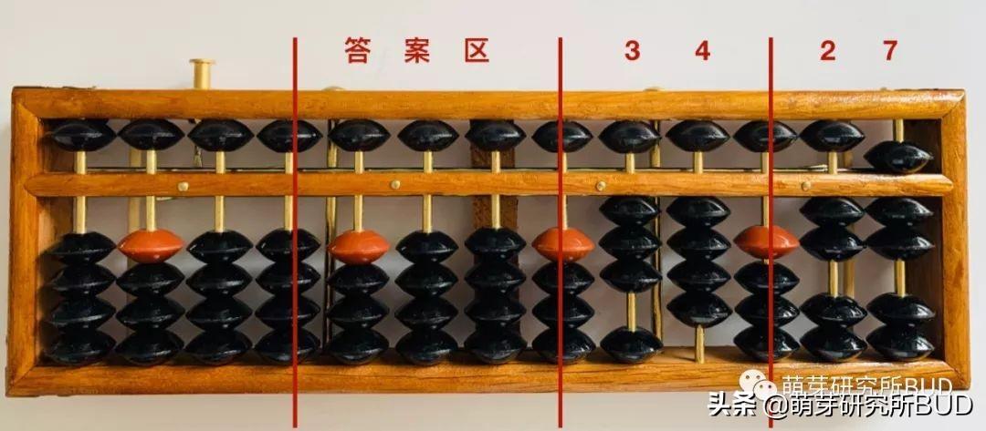 如果用珠心算来教学,实际上算盘会分为3个栏目,两栏是数字,最后一栏是答案区。▼