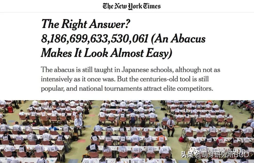 再后来我们去看一些美国原版的英文数学书,里面也都有提到算盘的神奇之处,包括那段时间我们在国外看新闻,孩子们还发现了《纽约时报》报道的,刚刚结束的日本珠心算大赛。用一个小小的算盘就能算出8,186,699,633,530,061 这个数字,对于年幼的孩子们来说,简直难以想象是怎么算出来的。▼