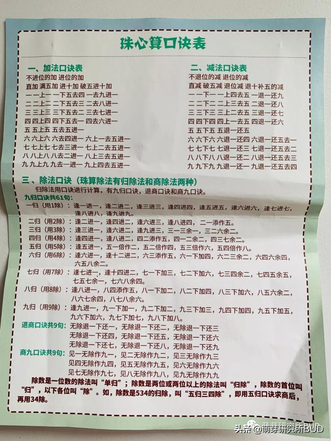 但是国内在珠心算的培训方面,却有一套另外的规则,我们市场上有一种风向,是通过珠心算来培养“神算子”、神童小孩。口诀表便是这个风向下的产物,比如这个是淘宝店主发给我的,说培训机构都在用的“秘籍”,加法口诀、除法口诀……这些我看了都头痛的东西,很难想象就是现在市场上风靡的珠心算培训班里,用来强塞给我们年幼孩子进行培训的。▼