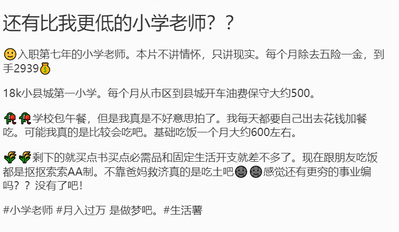 而且更尴尬的是,到今年为止,这位小学女老师已经入职了第七年,每个月除去五险一金,到手的只有2939块钱。感觉人生真的不值得。