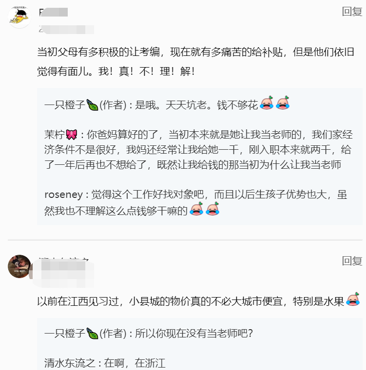 无独有偶,评论区也出现了很多受害者。大家当年都是被父母劝着一定要考教师编,结果考完教师编工资太低,父母却依然觉得非常有面子。