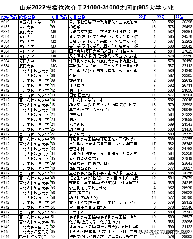 山东2022年投档线介于21000-31000的985专业多达45个