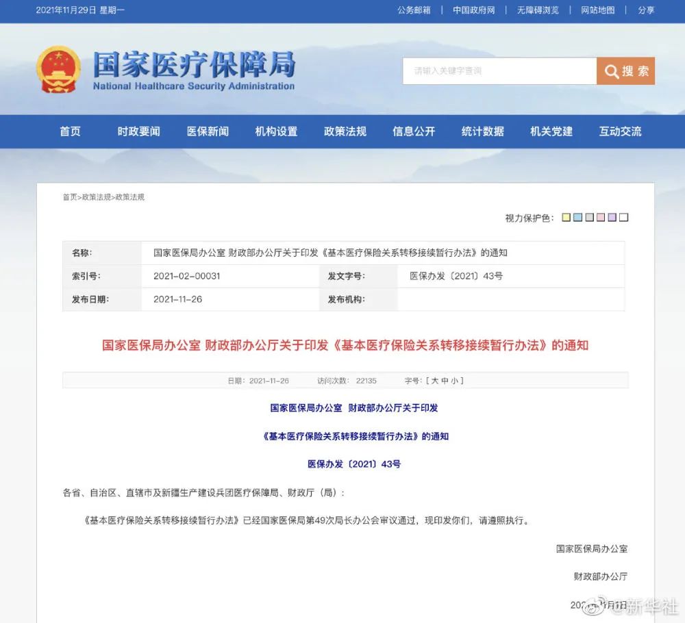 两部门印发《基本医疗保险关系转移接续暂行办法》