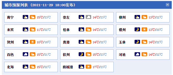 11月30日,全区多云到晴。各地最低气温:高寒山区2~7℃,桂北8~12℃,桂南13~16℃。