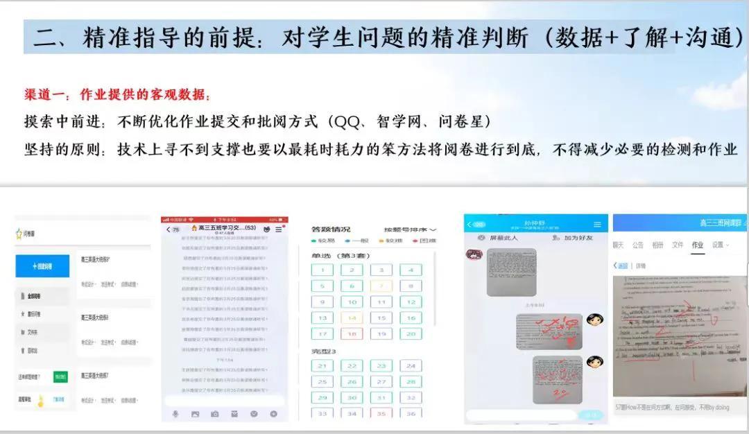 虽然不能“相见”,但是对话却从未停止,毕业班的对话更是比以往的线下更多,“精准”就逐渐成为高质量对话的必然要求。精准的对话源于精心的课堂设计、耐心的文字语音,更源于对“互联网+”的不断探索,用数据做支撑,用调研集材料,实现对话的高质量。