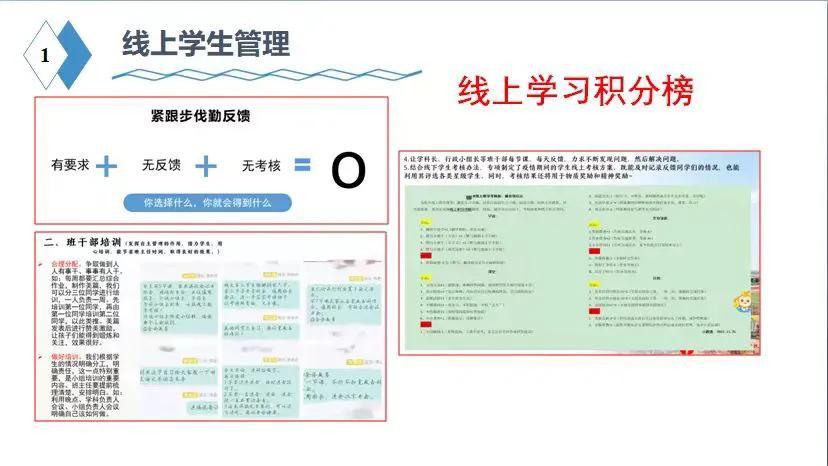 班主任联合各科任老师每日做好详细的作业反馈,公布优秀作业,让学生的进步被看见,不定期举行线上学习竞赛,让学生时刻保持学习的紧张感,同时利用好每周线上班会对学生进行思想教育,引导学生明确学习目标,激发学习动力。