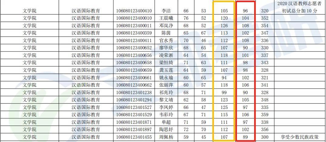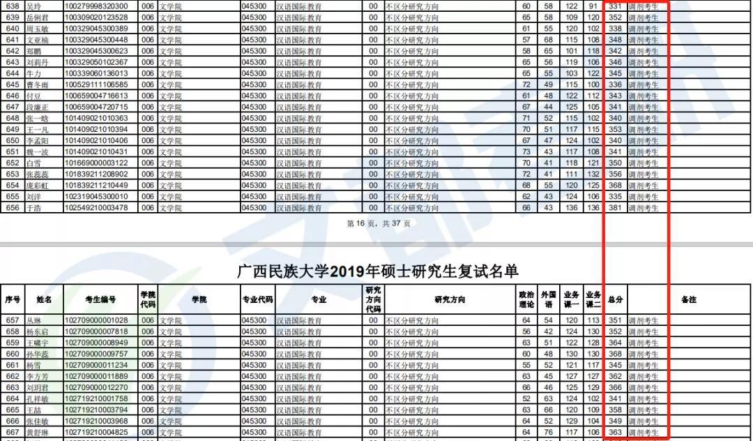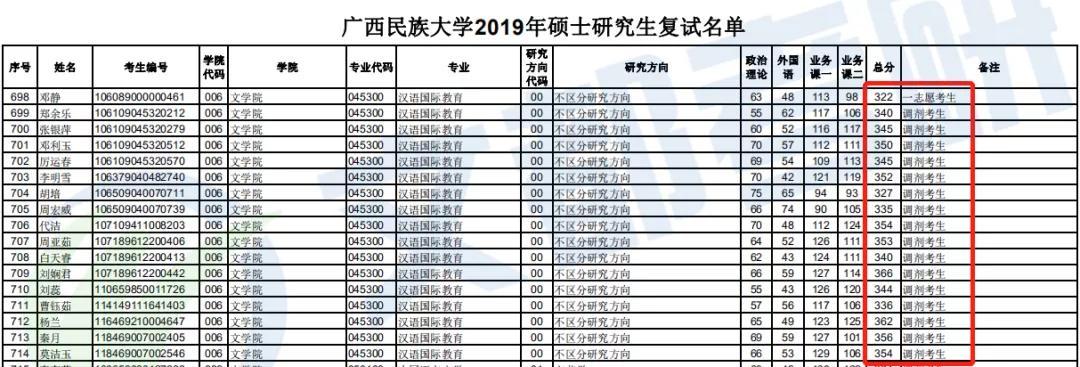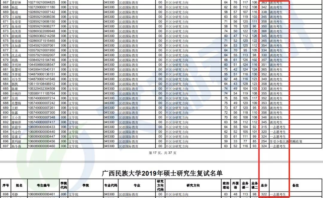 在2019考研中一共录取了37人,复试差额比是1:2,其中可以看到录取名单的前5位都是一志愿报考考生,虽然他们的初试成绩不高,复试成绩个别还出现非正常低分,但是最后都录取了,可见广西民族大学的汉硕还是保护一志愿考生的;而对于初试成绩较低的调剂考生而言,复试则是需要格外重视的环节了,调剂生能不能顺利上岸,就要看复试的表现了。值得一提的是,唯一享受少数民族照顾政策的考生最后被无情地刷掉了,原因是他的初试成绩太低了,公共课和专业课均是非常低的分数,虽然广西民族大学是有少数民族照顾政策,但并不意味着少数民族考生报了这个政策就能拿到一块免死金牌,初试不用功,成绩太差,导师一样不要你!