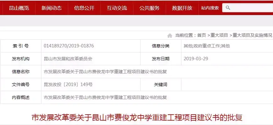 项目拟实施昆山市费俊龙中学重建工程,用地面积约92487平方米,新建总建筑面积约39426.59平方米,同时建设相应配套设施。