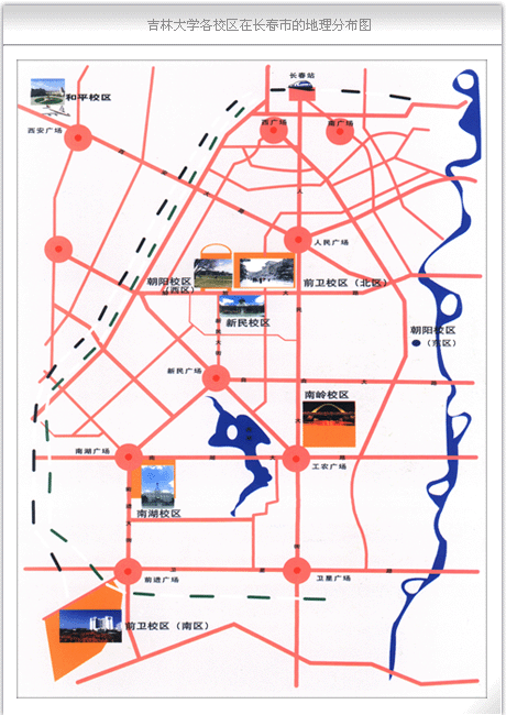 前卫校区为原吉林大学所在地;南岭校区为原吉林工业大学所在地;新民校区为原白求恩医科大学所在地;朝阳校区为原长春科技大学所在地;南湖校区为原长春邮电学院所在地;和平校区为原中国人民解放军军需大学所在地。