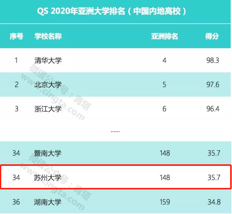2019年11月27日,QS发布了2020亚洲大学排行榜(QS University Rankings Asia 2020)。QS亚洲大学排名的指标体系共有11项指标。本次排名数据包括全球最大的学术同行评议以及顶尖用人单位调查,参考了全球94672名顶尖学术专家以及44884家用人单位的意见。苏州大学位列内地高校第34名,亚洲排名148位。