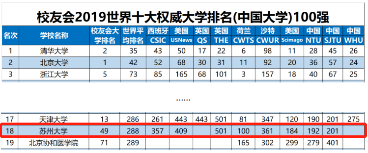 2019年5月22日,艾瑞深中国校友会网(Cuaa.Net)首次公布《校友会2019世界大学排名分析报告》。报告依据2018-2019年英国QS、英国THE、美国USNews、美国Scimago、西班牙CSIC、荷兰CWTS、沙特CWUR、中国NTU、中国SJTU和中国WHU等全球公认的世界十大权威大学排名中国高校排名结果,最新发布校友会2019世界十大权威大学排名(中国大学)和2019世界十大权威大学排名(中国各类型大学)等系列排名。苏州大学位列中国大学排名第18位。