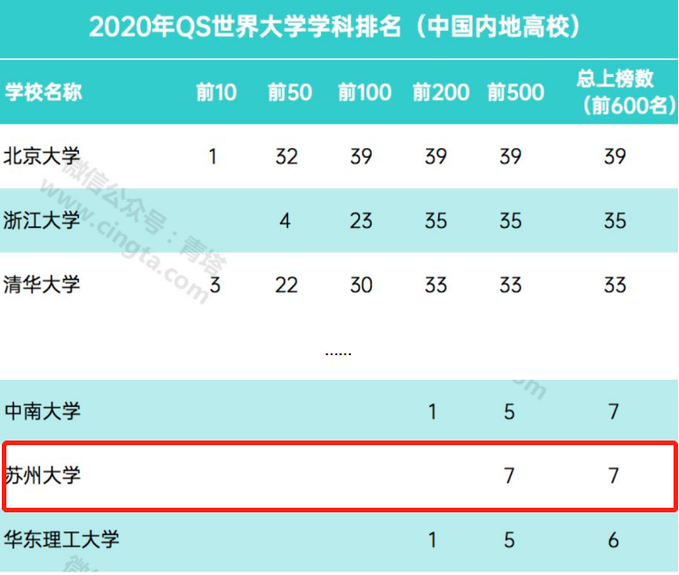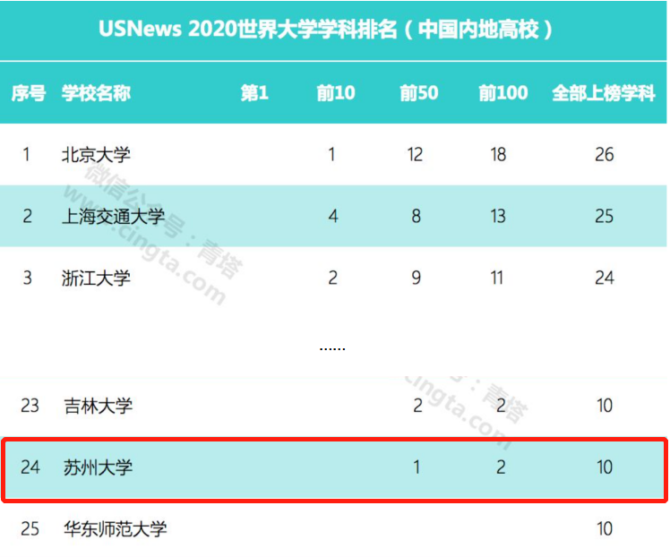 除了世界大学排行榜之外,USNews还公布了2020世界大学学科排名。苏州大学位列内地高校第24位,其中世界前50名学科1个,前100名学科2个,全部上榜学科10个。