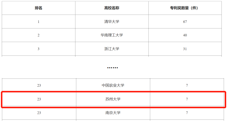 中国专利奖是衡量高校专利质量和科技创新能力的重要标志。2020年1月,国家知识产权大数据产业应用研究基地发布《中国高校专利奖排行榜》。苏州大学位列第23名。