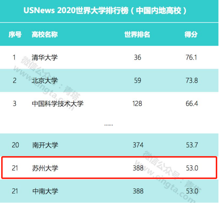 2019年10月22日,USNews发布2020世界大学排行榜,USNews排名不单单考量学校的本科或研究生教育,而是根据13项指标进行排名,这些指标衡量学校的整体学术研究表现以及其全球和地区声誉。中国共有223所高校入围,其中内地高校188所。苏州大学位列中国内地高校第21名。