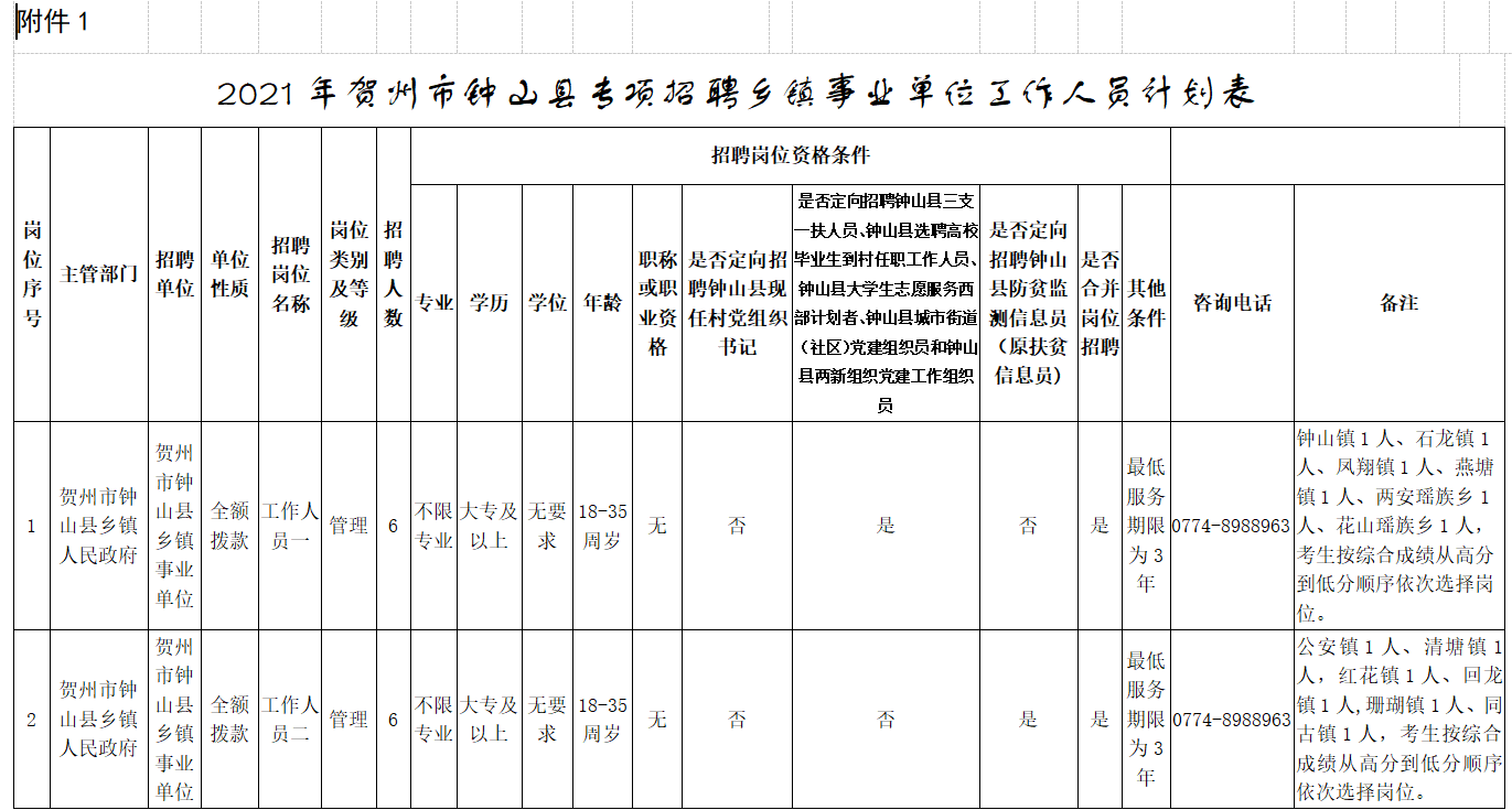 计划专项招聘乡镇事业单位工作人员共14名,其中面向钟山县现任村党组织书记招聘2名,面向“服务基层项目人员”招聘6名,面向钟山县在岗县级、村级防贫监测信息员(原扶贫信息员)招聘6名。