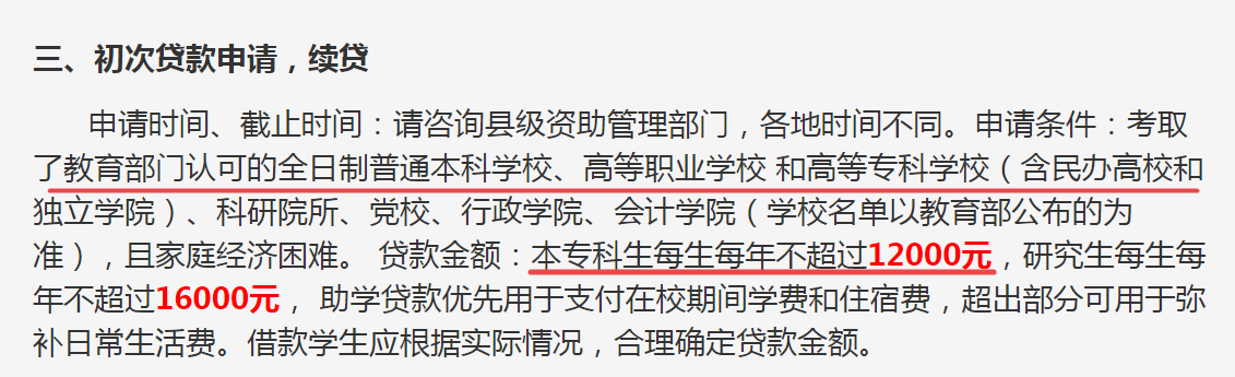 同时,还规定本科生以及专科生,每人每年可以申请最多12000元的助学贷款,主要用于支付在校期间的学费和住宿费,超出部分可以用于生活费。