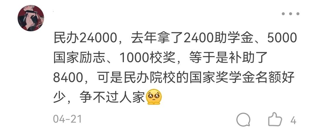 这位同学说,上的也是民办大学,学费2.4万/年,然后,去年拿到了2400元的国家助学金,又拿到了5000元的国家励志奖学金,还有1000元的校级奖学金,相当于光补助就拿到了8400元。