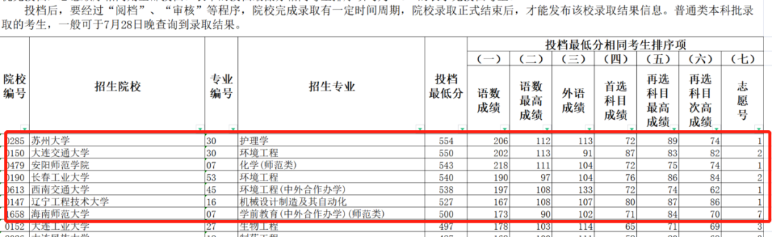 物理类本科省控线为362分,而第一次征集志愿中,苏州大学的护理学专业投出了554分,比省控线高出了将近200分,大连交通大学的环境工程专业、安阳师范学院的化学(师范类)、长春工业大学的环境工程、西南交通大学的环境工程(中外合作办学)、辽宁工程技术大学的机械设计制造及其自动化、海南师范大学的学前教育(中外合作办学)(师范类)投档分都在500分以上。