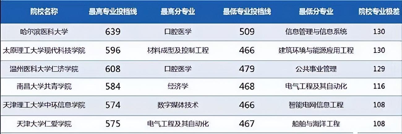 还有像华北电力大学科技学院,南京师范大学泰州学院、北京科技大学天津学院等六所独立学院在浙江第一段的录取分数与众多的985高校旗鼓相当,甚至像中国石油大学、大连海事大学、中国药科大学、海南大学、辽宁大学、东北师范大学、华中农业大学这些211高校的最低投档线都还要低于这6所独立学院。