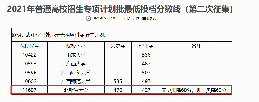 广西文科一本分数线为530分,理科一本线为487分。没有想到北部湾大学在提前批的招生里面,根本没有办法完成招生任务,每次征集志愿都降30分,如今已经降60分,具体如下。