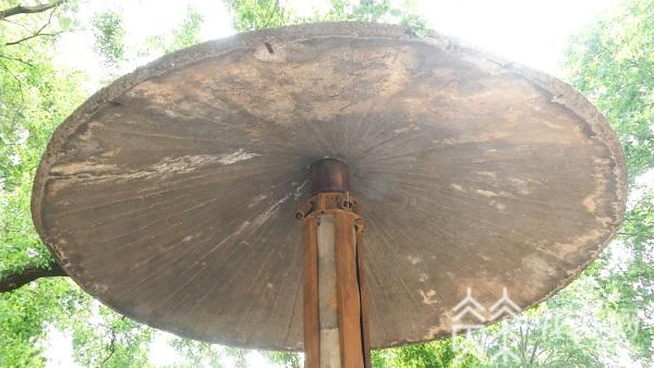 与两只貔貅同时被誉为老图书馆"镇馆之宝"的,还有一个有着110岁高龄的"水泥阳篷"。如今,水泥阳篷也从老图书馆后面移到了丁家桥校区宿舍区。这是一处伞状的凉亭式建筑,以水泥制成,其顶盖用一根独立的亭柱支撑。为了保护它,学校专门在其四周辟出一个小广场,周边还加设了石凳,供师生们在建筑下休息观景。南京工业大学图书馆副馆长刘咸介绍:"你看那个伞叶倒过来就像一个荷叶一样,也是给中国工业带来一股清风,一种新鲜的理念,在当时110年前劝业会也是一道风景线。"