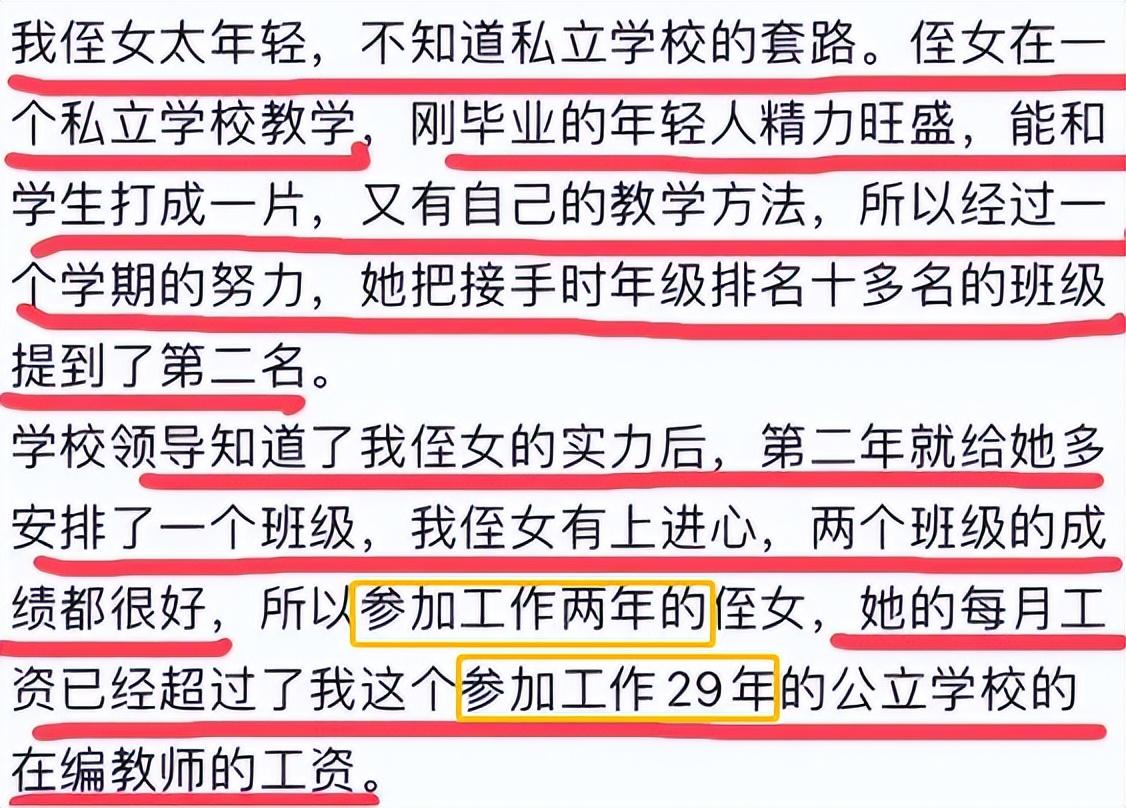 家里一位长辈是公立学校,拥有29年教龄的在编教师,薪资待遇竟还不如刚毕业的小刘高,一时间小刘有些飘飘然,错过了招教考试,觉得一直在私立学校当老师也挺好的,何苦还要为了考教师编制发愁,以后也不用为了评职称而烦心。