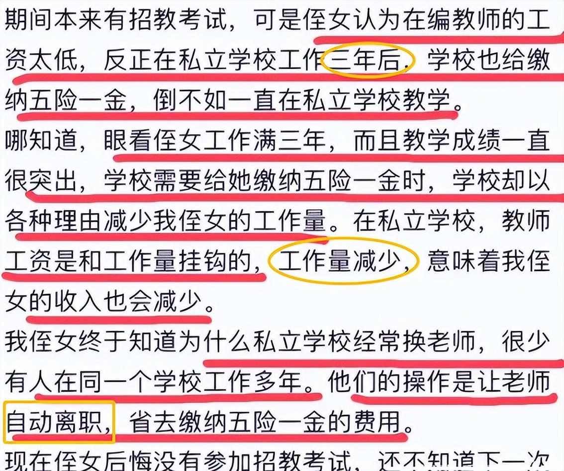 当然,小刘的经历只是个例,不是所有的私立学校都这么“不讲武德”。有的私立学校非常重视教师队伍建设,宁可花高薪聘请有能力的老师,只要学生成绩好,家长是不惜多交学费的,岂能在乎给老师缴纳五险一金这点运营成本。