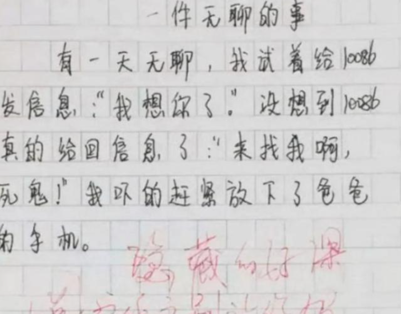 这篇《一件无聊的事》让小学生写得既幽默又心酸,他在开头写着:“有一天无聊,我试着给10086打短信:我想你了!没想到还真的给我回信息了”。