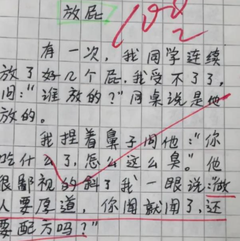 而这位小学生写的作文就很有幽默感,他在开头写着“有一次,我同学连续放了好几个屁,我受不了了,问:谁放的?同桌说是他放的”。