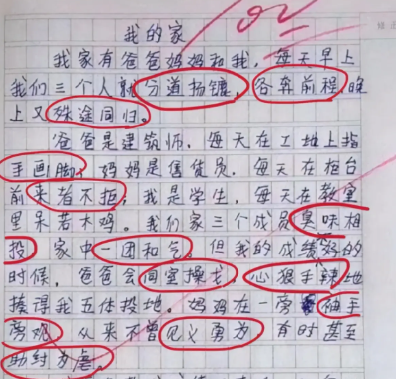 而且当老师在看到这篇作文的时候,也是直言:这作文别让妈妈看见。可家长们要知道,自己的一言一行对学生的影响是很大的,要想教育好学生,就应该做到以身作则,不要不该做的事!