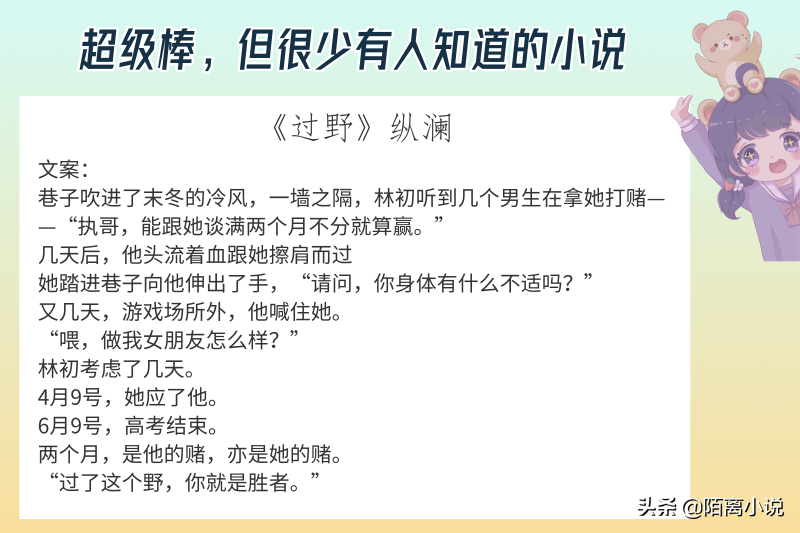 哈喽,大家好,这里是陌离小说!今天给大家介绍的是6本超级棒,但很少有人知道的小说,强推《过野》!一部关于校园暴力的小说……看的过程中没有哭……但到最后看完了……忍不住哭了好久好久……