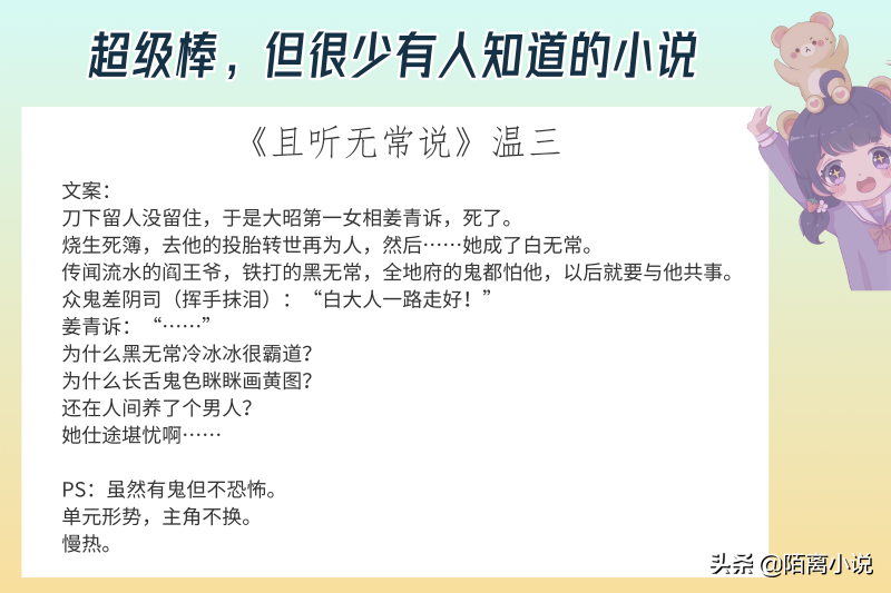 点评:第一次看涉及鬼妖生死的题材小说,文笔流畅 。男主是黑无常,名叫单邪,他的性格是从冷酷无情到柔情。其中的转化就来于与女主姜青诉,她与皇上有一段恋情,但她作为了皇上的臣,由于帝王之业,再加上朝臣对她的污蔑,最后被砍头,但是她没有投胎,与阎王下棋由于智慧再加上机缘巧合,最后成为了白无常。男主和女主一起在收伏妖和鬼的过程中有许多小故事内容各种各样,相识相知相恋,也知晓了男主的身世。其中也有很可爱的小跟班苏长释(监管生死蒲,写一些艳俗的小故事就包含了,白无常和黑无常)还有在人间可以存活下来的钟留(擅长捉妖,与一只报恩小狐狸相恋的故事)。总的来说,这部小说离奇但是又很吸引人眼球。