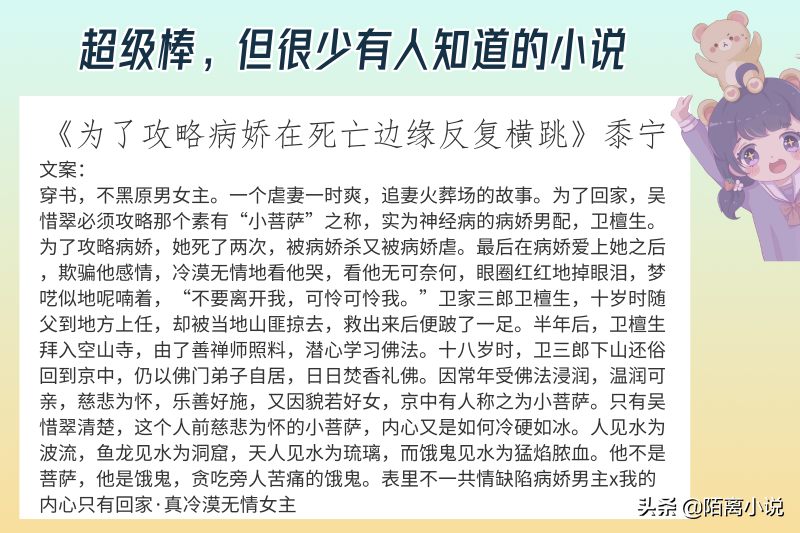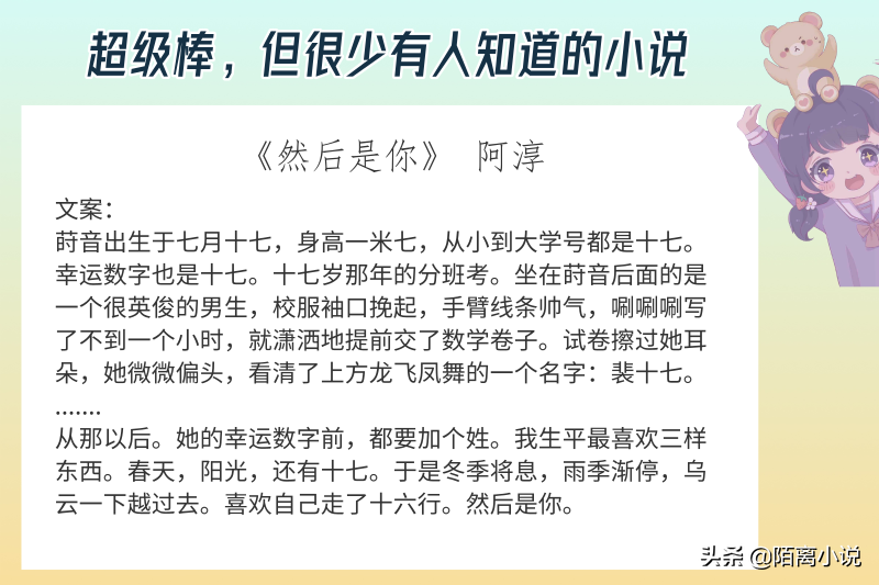 点评:这本书真的太好了。好到不想用太激动的感叹号给它平添浮躁hh。不仅仅停留在它作为一本言情小说的设定和感情处理上,更在于它对校园霸凌细腻周全而现实的呈现上。一开始看到被霸凌的乖乖学霸女主和混混头男主的2次相遇时,我以为又会是一个俗套的乖巧可怜学霸和嚣张狂傲校霸打赌假戏真做+调教“改邪归正”的纯言情小说,但女主自述的故意与男主相遇的心机和不惮以最大的恶意揣测男主的表现,使得这个故事向我们日常的现实靠拢(小学初中时候对年级的“混混”坏学生真的是这么警惕害怕的……)。