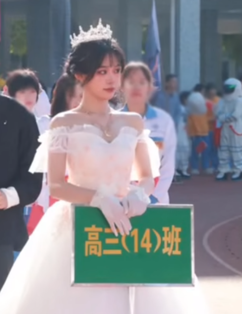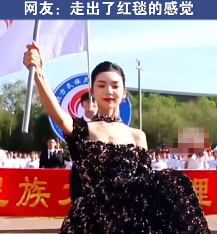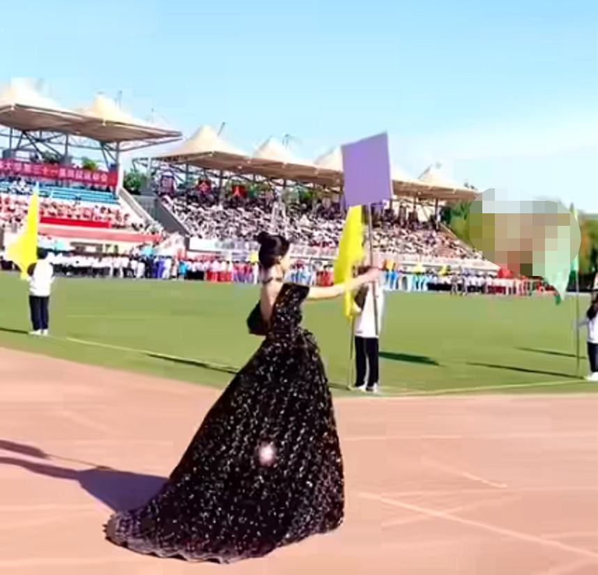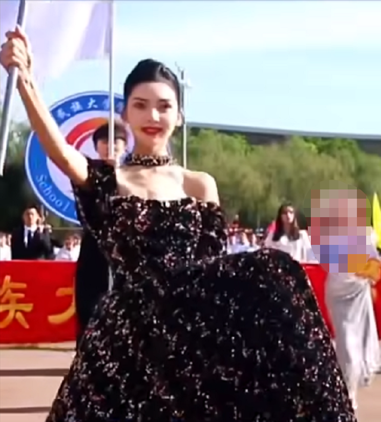 由于大学生运动会上举牌的女同学都要身穿礼服,这位女同学也是穿着非常漂亮的礼服,而且走起路来硬生生把操场走出了一种红毯的既视感。