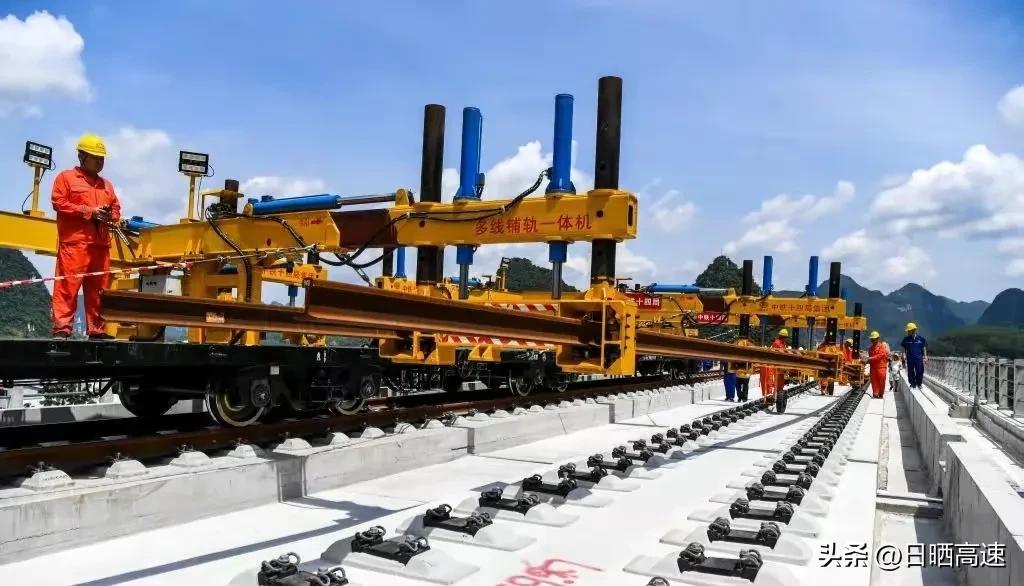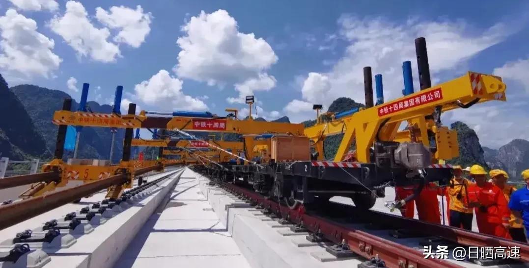 现在,广西河池的一台铺轨机将一段500米长钢轨铺设在贵南高铁龙江双线特大桥的无砟道床上,标志着贵南高铁正式进入铺轨阶段。建设中的贵南高铁是我国八纵八横高速铁路主通道包头至海口通道的重要组成部分,设计时速为350公里每小时