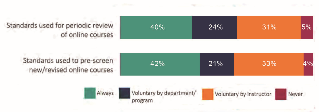 同时,针对线上课程是否需要质量评估这一问题,调查中的大学官员也存在明显分歧。虽然绝大多数人都确立了质量标准,但只有少数人(42%)表示他们始终使用这些标准来评估在线课程。在大多数人看来,质量评估应该是一项自愿活动,由教师本人及信息化和教学相关的部门负责(图2)。