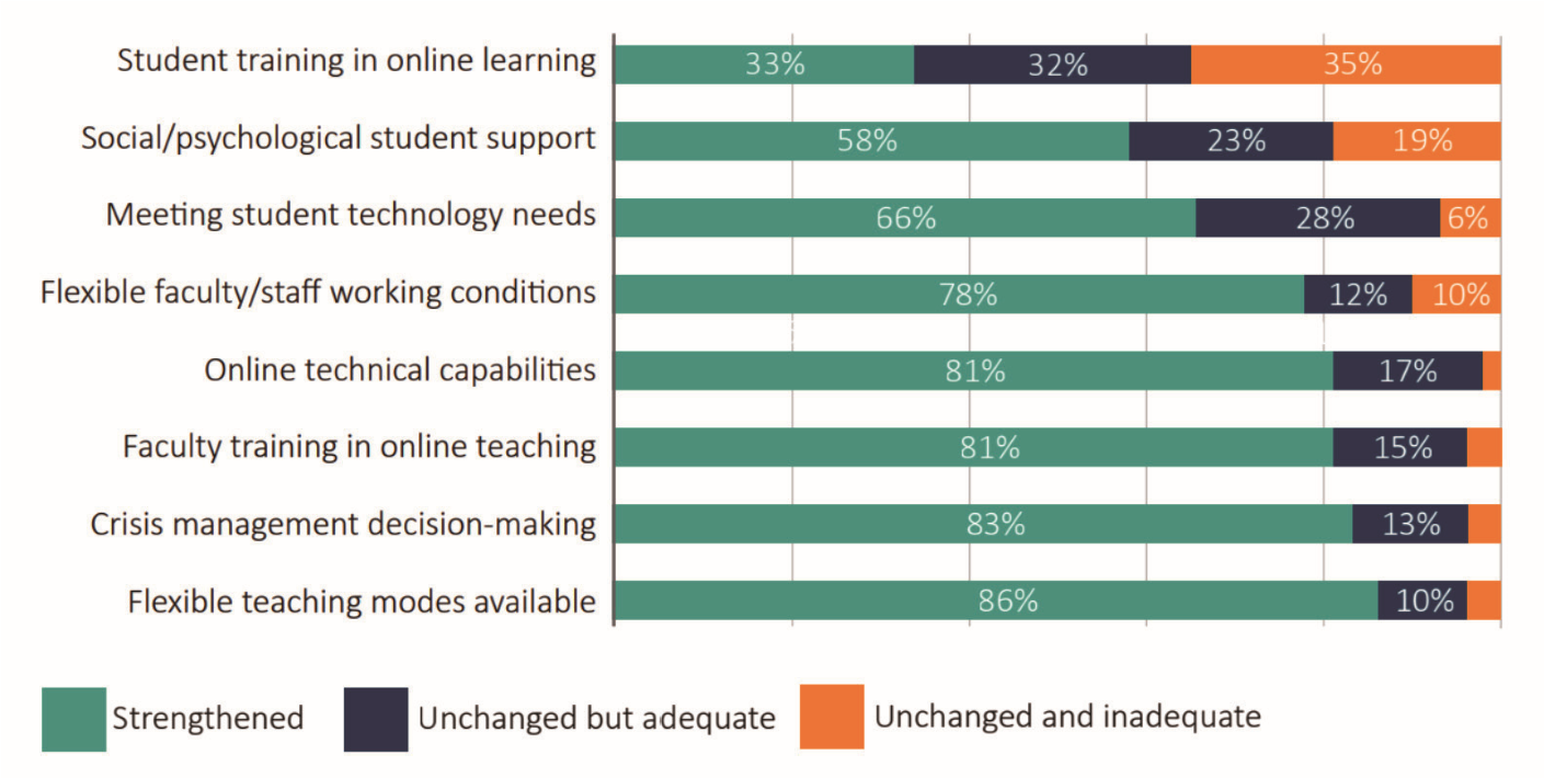 在调查中,96%的大学领导表示,他们依据质量评估机构开发的“质量保证标准”来指导这种转变。这些标准为教师们提供相关建议,例如如何降低在线学习的门槛,使课程更直观和有趣。建议包括教师设定合适的目标,提供及时、定期的作业反馈,确保课堂活动与学习目标一致,以及把所有视频资源提供给学生。
