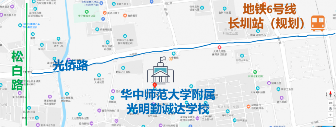 学校位于光明区玉塘街道长圳社区长松路1号,光侨路与侨松路交汇处东南角;毗邻6号线地铁站,交通便利,环境优美。学校办学规模为54个班、2520个学位,用地面积32403平方米,总建筑面积68626平方米。