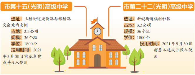 按照方案,2021年光明将建成市第十五(光明)高级中学、第二十二(光明)高级中学。光明高中园计划投资18.4亿元,用地面积17.9公顷,总建筑面积230000平方米。办学规模126个班,提供学位6300个,计划于2022年建成,秋季将开始入学招生,将大大缓解高中学位紧缺问题。