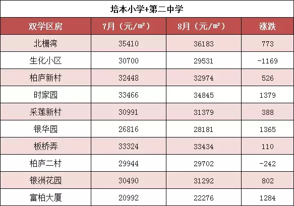 从学区均价上看,8月双学区价格平稳。8月涨幅最高的是培本小学+第二中学学区,本月均价30979元/平,较上月30074元/㎡,上涨2.9%;其次则是柏庐实验小学+第二中学双学区,本月均价31873元/平,较上月31004元/平上涨了2.7%。