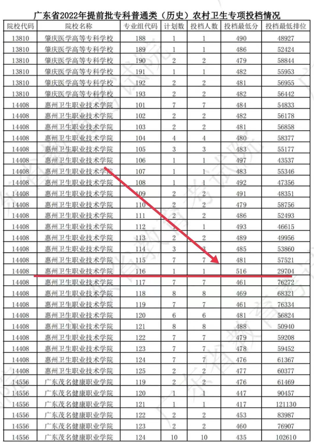 惠州卫生职业技术学院,116专业组(历史类)的投档最低线是516分,比广东的历史类本科线多79分,报考华北水利水电大学、长春中医药大学可以被录取。