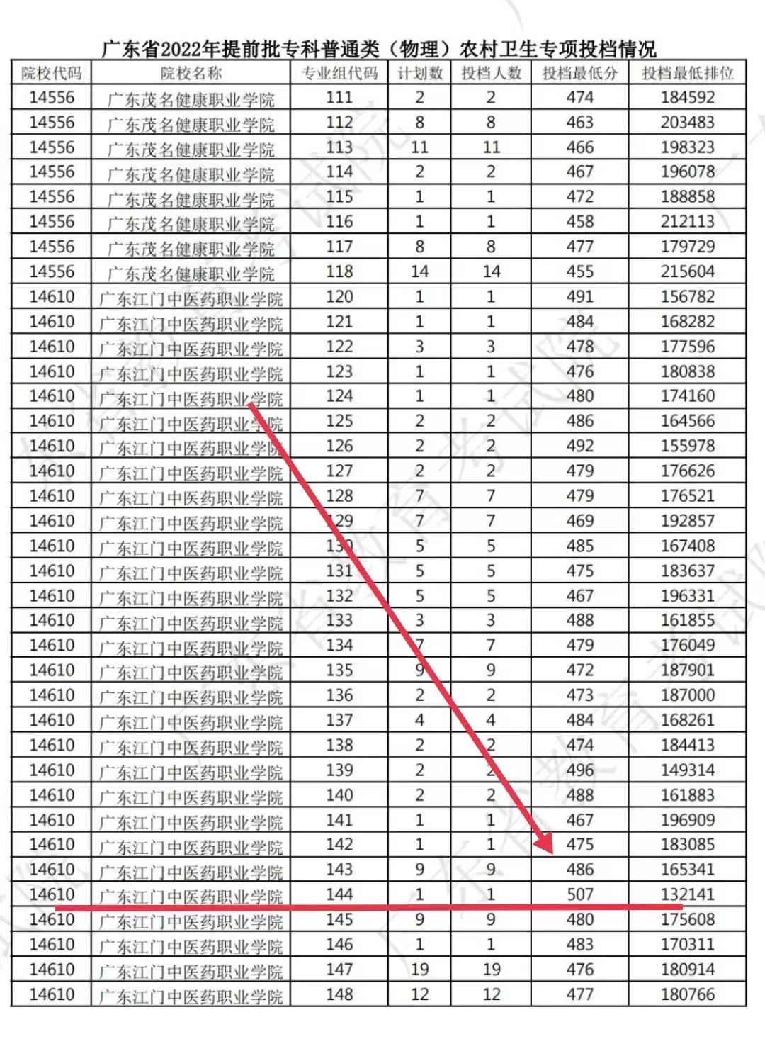 广东江门中医药职业学院,144专业组(物理类)的投档最低线是507分,比广东物理类本科线多62分,如果报考武夷学院、潍坊医学院、怀化学院等本科高校,有机会被录取。
