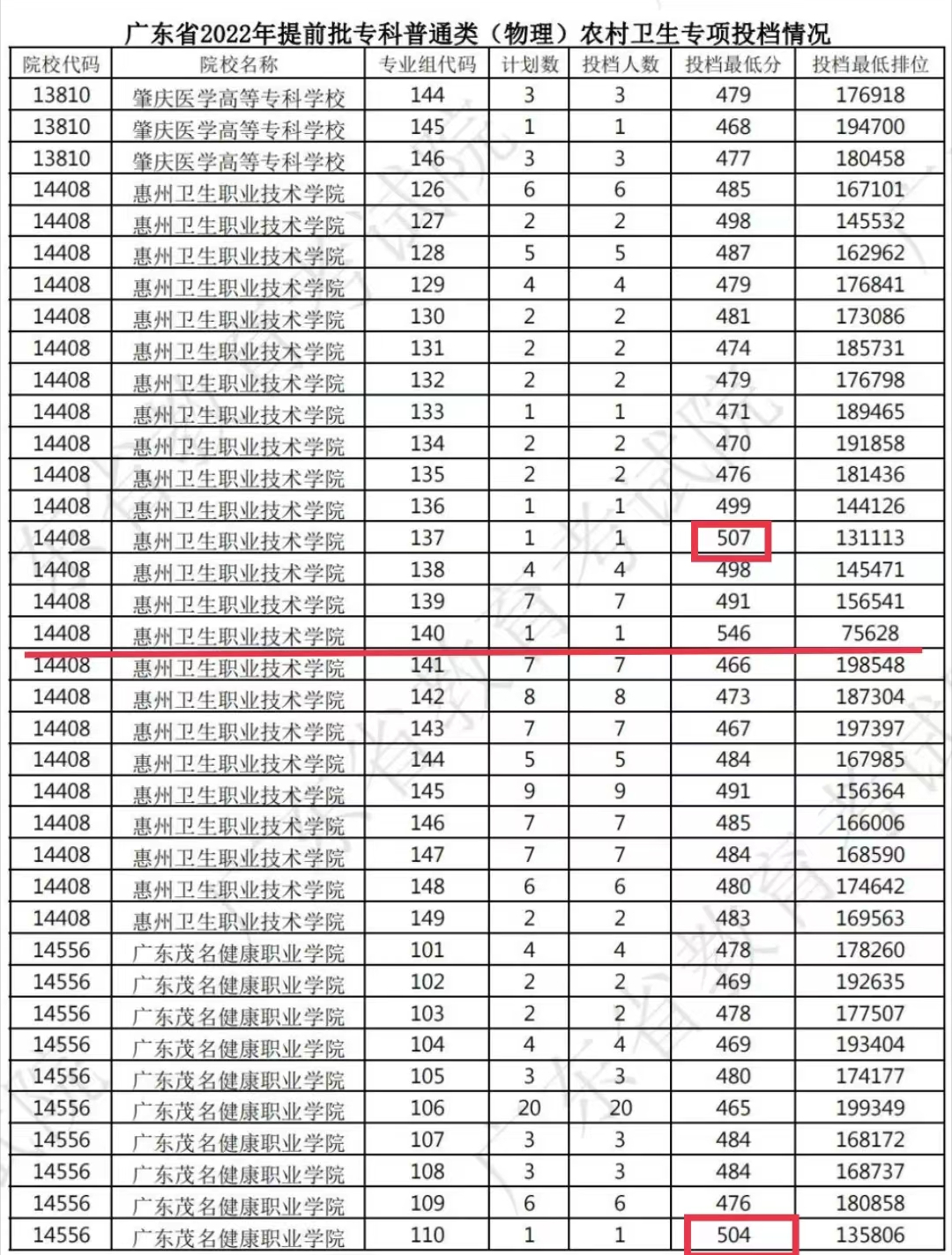 惠州卫生职业技术学院,136专业组(物理类)的最低投档线是507分;140专业组(物理类)的投档线是546分,超出广东的物理类本科线101分,报考河北医科大学、福建中医药大学都能被录取。