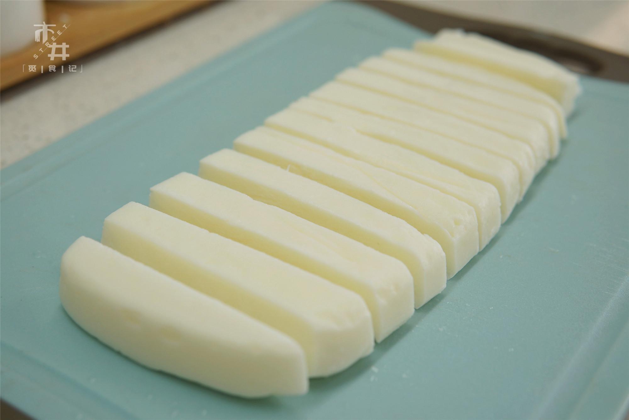 3、将冷冻好的鲜奶糊从冰箱中拿出,脱模,切成大小合适的长条。