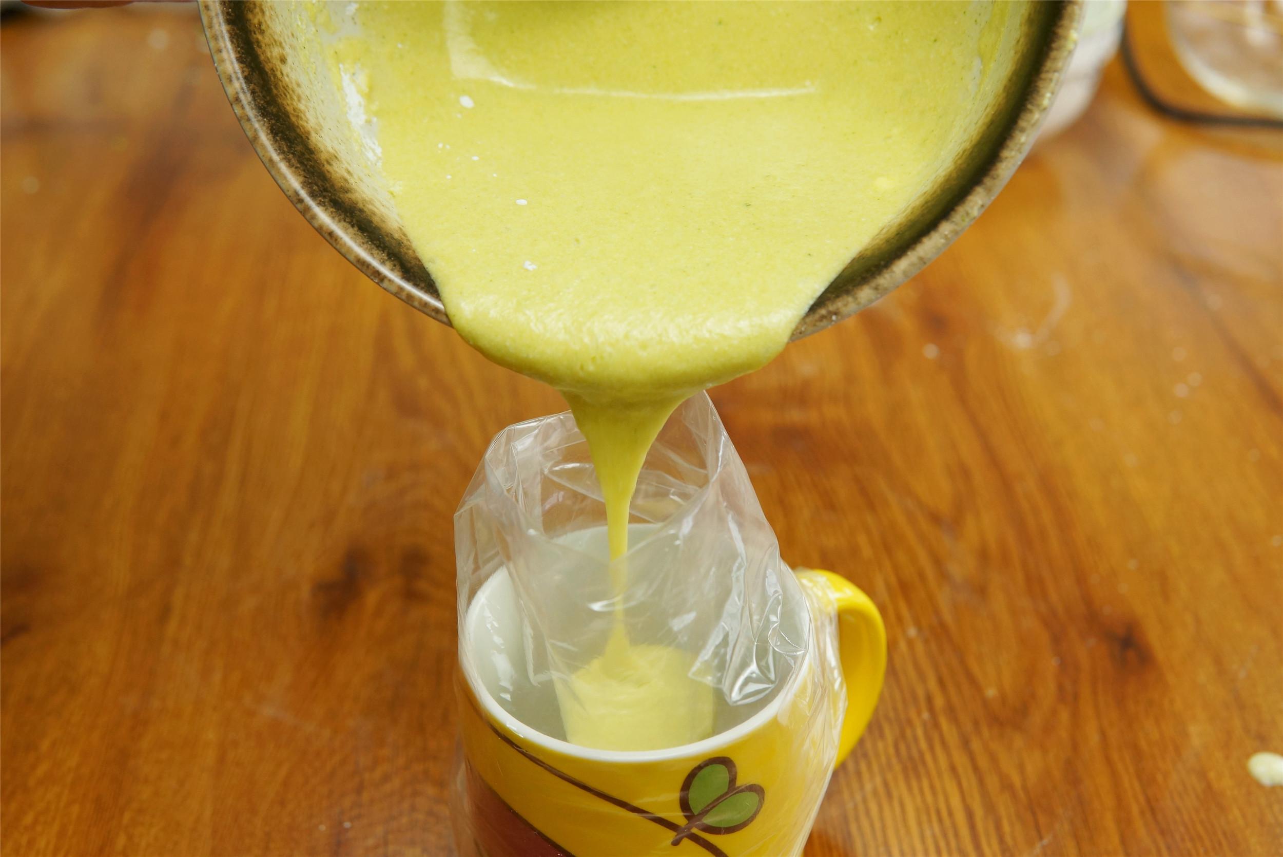 7、将拌匀的蛋液倒入量杯或者裱花袋中,倒入合适的蛋糕模具中