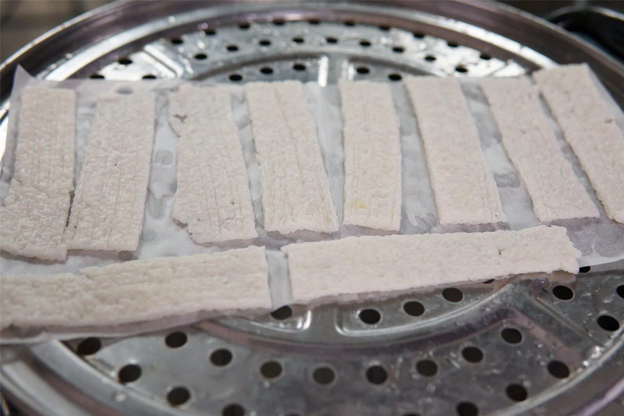 3、蒸好后的辣条胚,放入烤盘中,上下200度,烤10分钟左右,辣条坯子就做好了。