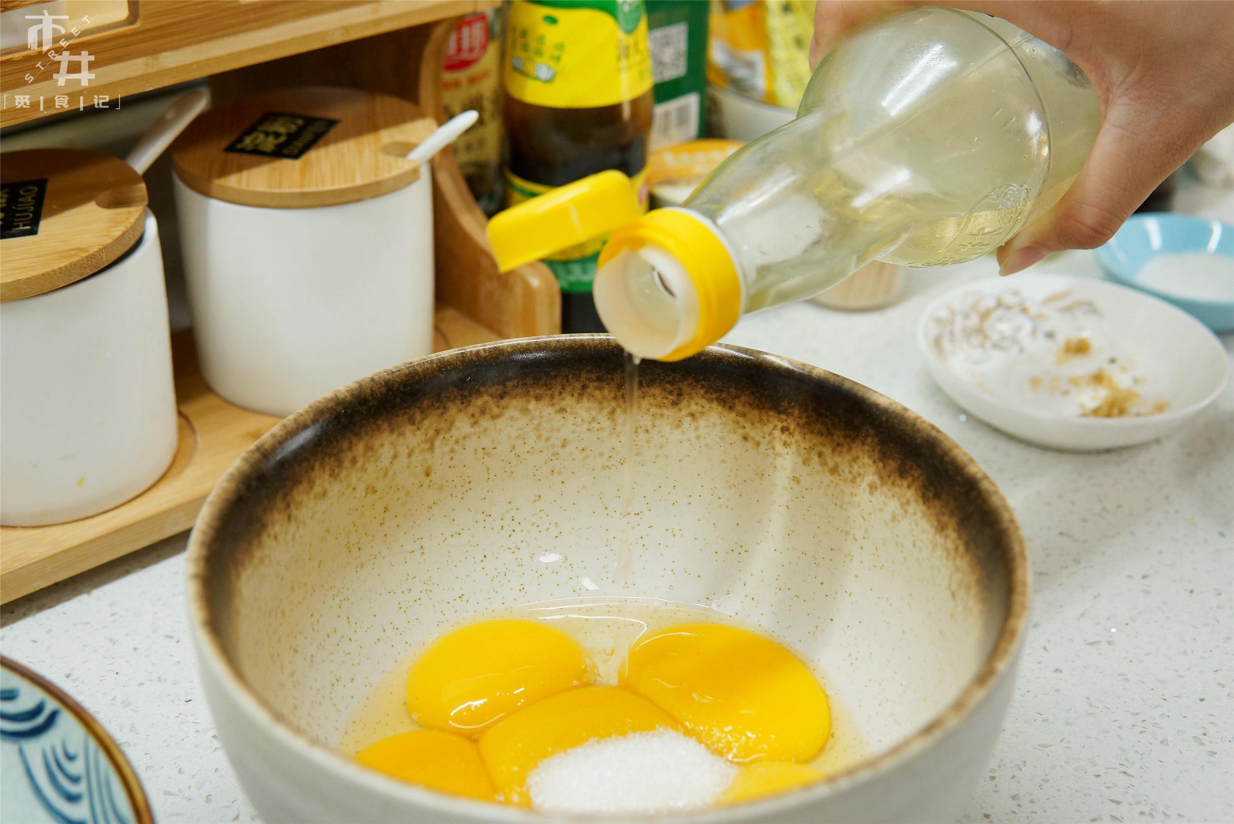 1、用黄分离器将6个鸡蛋的蛋清和蛋黄分离,留蛋黄,加入5克白醋,10克白糖。