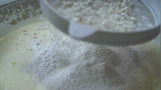 6、用硅胶铲或者木铲翻拌蛋糊,一定是翻拌,不能搅拌或者画圈圈,否则很容易将蛋液消泡,拌匀看不到干面粉即可。