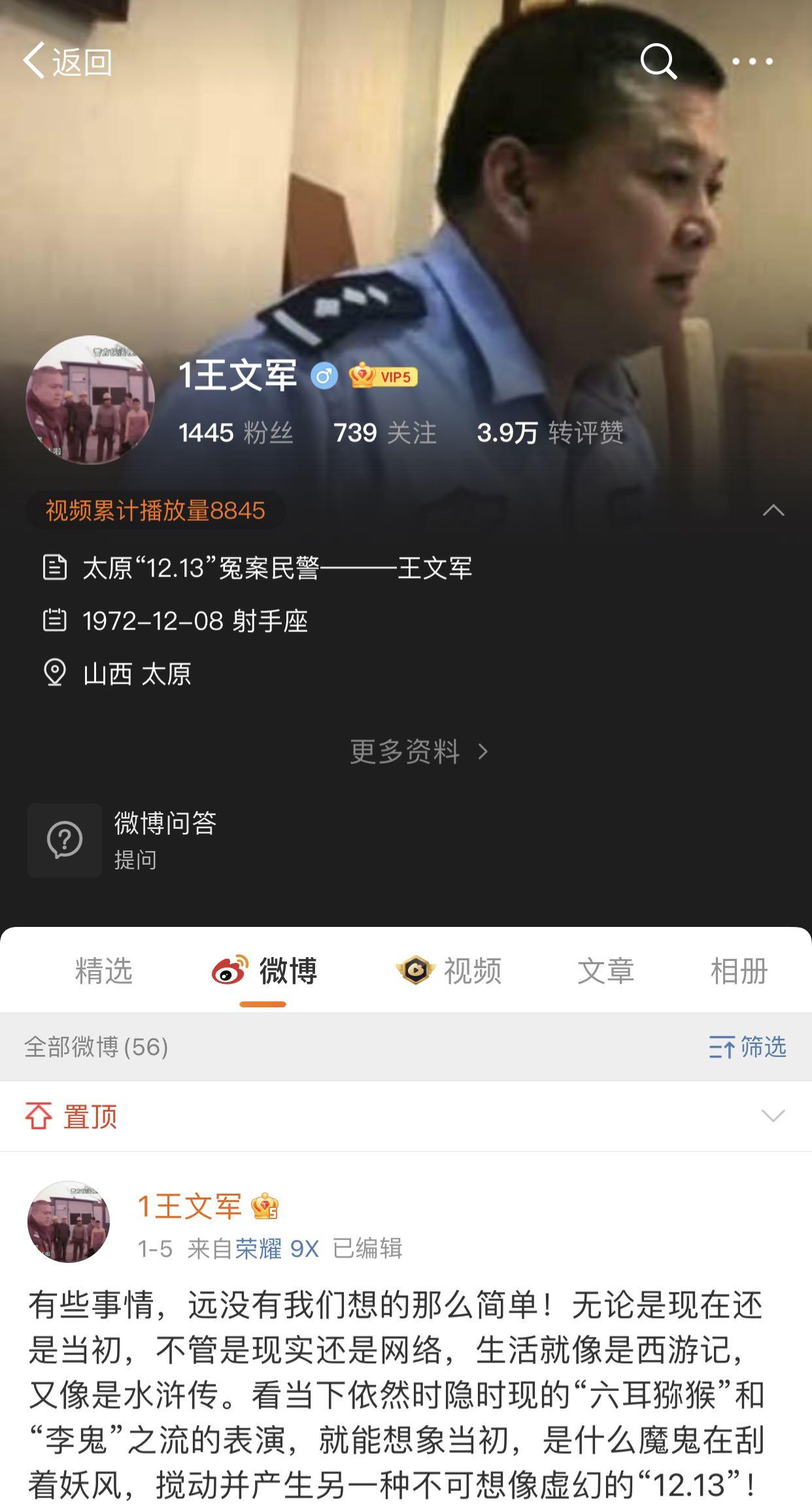 但王文军的申诉,在山西省内的司法机关奔波了大半年,寄出去的申诉信等材料都如石沉大海没有音信。这时有朋友提醒他,可以开一个社交媒体账号,到网上喊冤,而王文军一开始比较抗拒,我“当了十四年兵,又当了十年警察,都是按照(体制内)规则去做事”,但后来发现“(按规则)寄出去的材料,根本就没人去看”,他最终选择了上网,注册了微博账号。